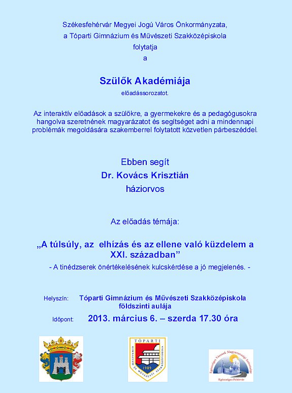 A túlsúly, az elhízás és az ellene való küzdelem a XXI. században - ezekről lesz szó a Szülők Akadémiájának következő össze- jövetelén. Ezúttal Dr. Kovács Krisztián háziorvos tart előadást március 6-án (szerdán), 17.30 órakor a Tópartiban. Az interaktív előadások a szülőkre, a gyermekekre és a pedagógusokra hangolva szeretnének magyarázatot és segítséget adni a mindennapi problémák megoldására szakemberrel folytatott közvetlen párbeszéddel.
