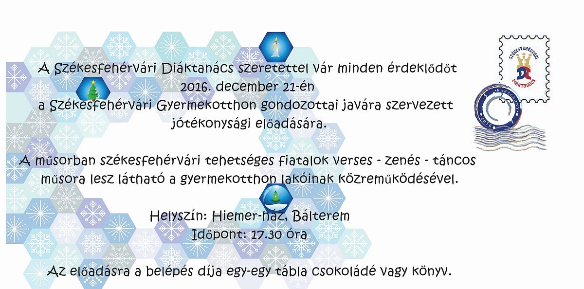 Ismét jótékonykodik a Székesfehérvári Diáktanács. A szervezet a Fejér Megyei Gyermekvédelmi Szakszolgálat Tüzér utcai intézményében élők javára rendez jótékonysági estet december 21-én, szerdán 17.30 órai kezdettel a Hiemer-ház Báltermében. Az igényes műsorban tehetséges fehérvári fiatalok adnak színes, igényes, táncos-zenés számokból, versekből álló műsort, illetve a gyermekotthon lakói is fellépnek saját karácsonyi előadásukkal. Ugyancsak a program keretében adják át annak a rajzpályázatnak a díjait, melyet „Jobb adni, mint kapni” mottóval hirdetett meg a Diáktanács óvodásoknak és általános iskolásoknak.