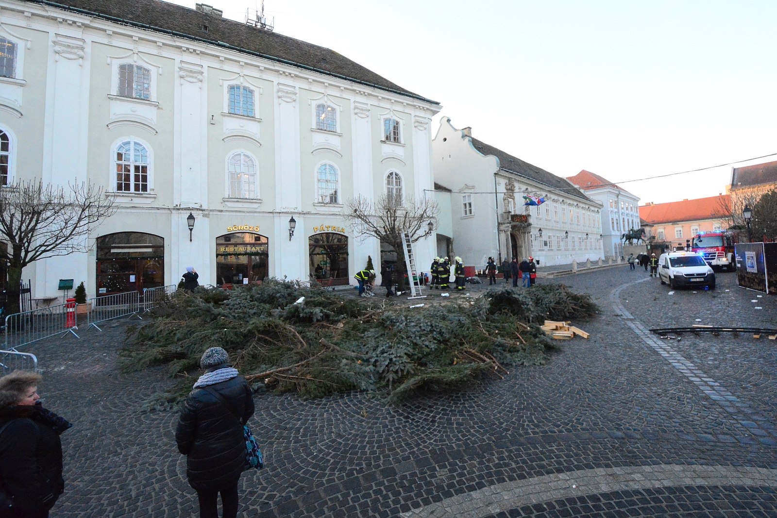 Feldöntötte a viharos szél a város karácsonyfáját Székesfehérváron. A hivatásos tűzoltók vonultak a helyszínre, ahol átvizsgálták a környéket, és megállapították, hogy a fa díszletekre dőlt, nincs alatta senki. A fát sajnos jóval vízkereszt előtt el kellett vinni a térről.