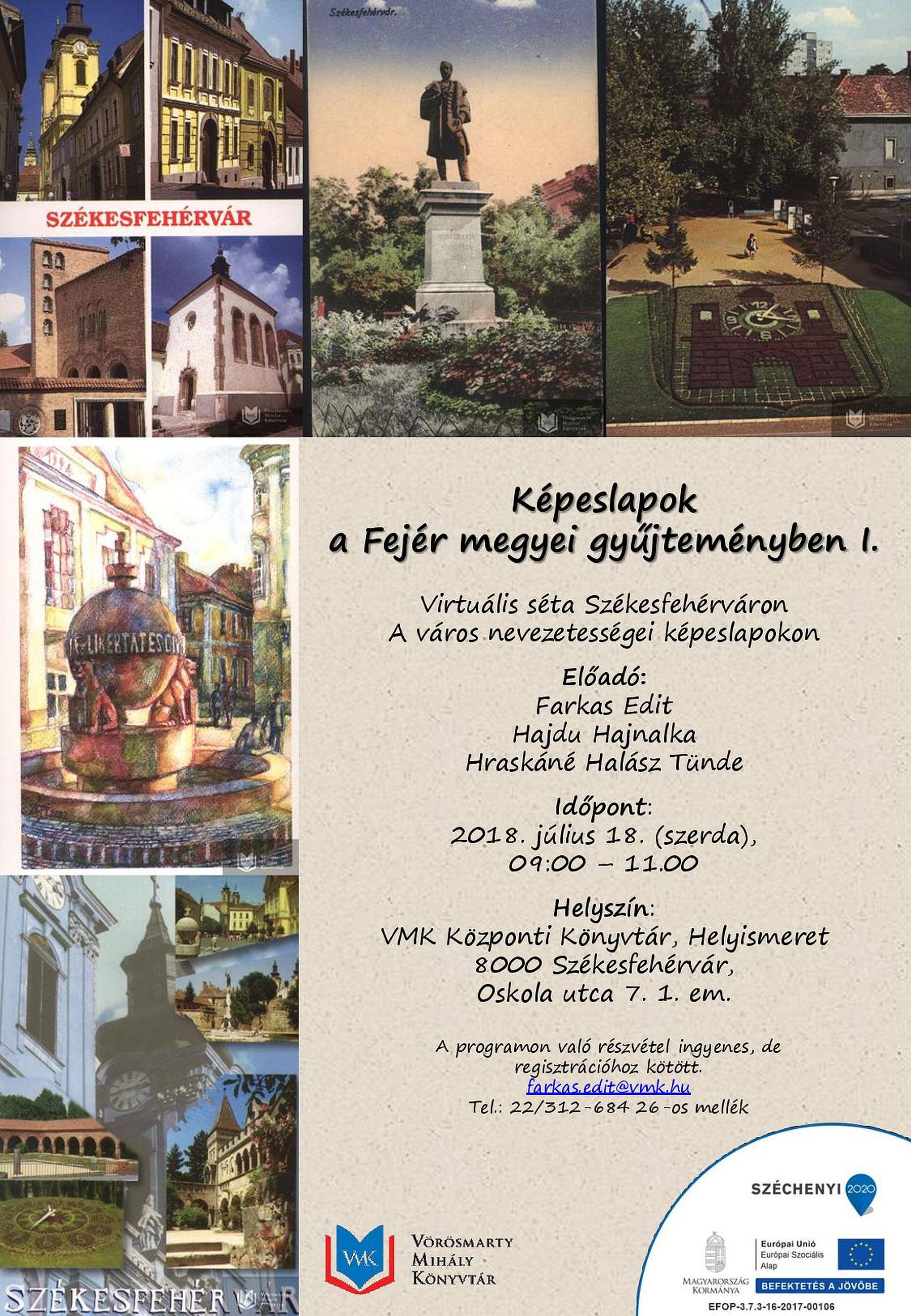 Virtuális sétán vehetnek részt az érdeklődők július 18-án, 9.00-11.00 óráig a Vörösmarty Mihály Könyvtár 1. emeletén. Farkas Edit, Hajdu Hajnalka és Hrakáné Halász Tünde előadása alkalmával képeslapokról elevenednek meg Székesfehérvár nevezetességei, a Belváros, az Országalma és a Bazilika.