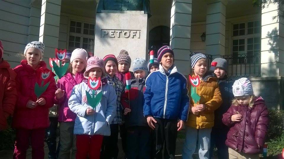 A Felsővárosi Óvoda Cica csoportjának gyerekei nemzeti színű tulipánt készítettek és elvitték a Budai út Várkörút sarkán álló Petőfi szoborhoz, de jutott a Sűtő utcai Petőfi parkban található szobor talapzatához is a papírvirágokból.