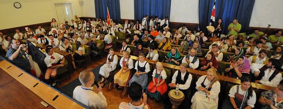 Csütörtökön délelőtt a Városházán fogadták a XVII. Királyi Napok Nemzetközi Néptáncfesztivál résztvevőit. A világ különböző országaiból érkezett táncosokat dr. Cser-Palkovics András polgármester köszöntötte Brájer Éva és Róth Péter alpolgármesterekkel közösen, majd a nemzetek egy-egy jellegzetes dallal mutatták be nemzeti kultúrájukat. Néhány perc erejéig bepillantást nyerhettünk Costa Rica, Franciaország, Spanyolország, Finnország, Macedónia és Grúzia hagyományaiba is.