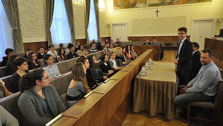Dr. Cser-Palkovics András üdvözölte a jelenlévőket és köszönetét fejezte ki, hogy a diákok elfogadták a meghívást. A polgármester elmondta, hogy a március 15-ei ünnepségnek az a hangulata, amit elsősorban a közreműködő fiataloknak köszönhetően élhetett át a város, sokak számára maradt nagyon emlékezetes. „Szerettünk volna alkalmat találni arra, hogy a város és az akkor éppen arra járók nevében megköszönjük ezt a szép előadást. Azt, hogy a próbákon felkészülve, aztán pedig élesben felelevenítettétek az egykori forradalmi hangulatot Székesfehérvár belvárosában. Hadd köszönjem meg nektek Mészáros Attila tanácsnokkal közösen, hogy ezt önként vállaltátok, saját szabadidőtöket erre áldoztátok, és fiatalos lendülettel megvalósítottátok a programot. Élő példáját adtátok annak, hogy lehet és érdemes is megszólítani a fiatalokat, be lehet őket vonni a programokba és így velük együtt válnak teljessé ezek az ünnepségek. Sokadszorra voltam nagyon büszke a diákokra. Bízom benne, hogy lesznek még ilyen március 15-ék és olyan diákok, akik vállalkoznak egy-egy ilyen rendezvényre. Nagyon fontos üzenete van annak, ha ezeken a programokon fiatalok vesznek részt, elsősorban a többi fiatal felé. Ilyen értelemben missziót teljesítettetek, így méltán lehettek ti is büszkék magatokra, társaitokra, hogy ebben a munkában részt vettetek." - mondta a polgármester.