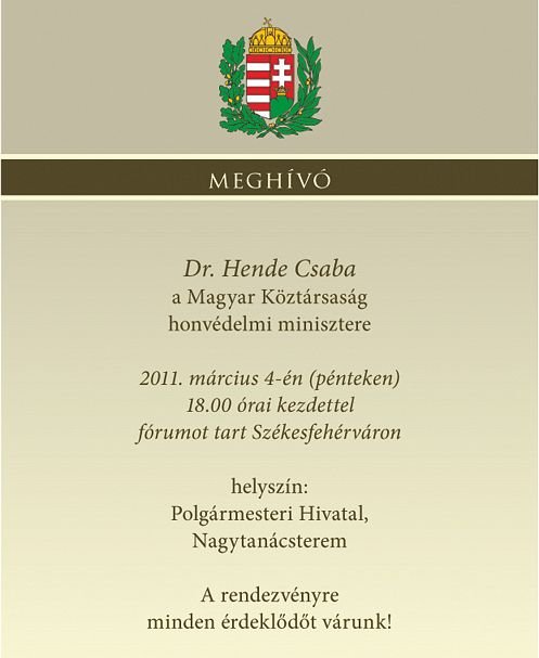 Március 4-én, pénteken este hat órakor a Magyar Köztársaság honvédelmi minisztere dr. Hende Csaba tart fórumot Székesfehérváron a Városháza Nagytanács termében. A nyilvános rendezvényre minden érdeklődőt szeretettel várnak a szervezők!