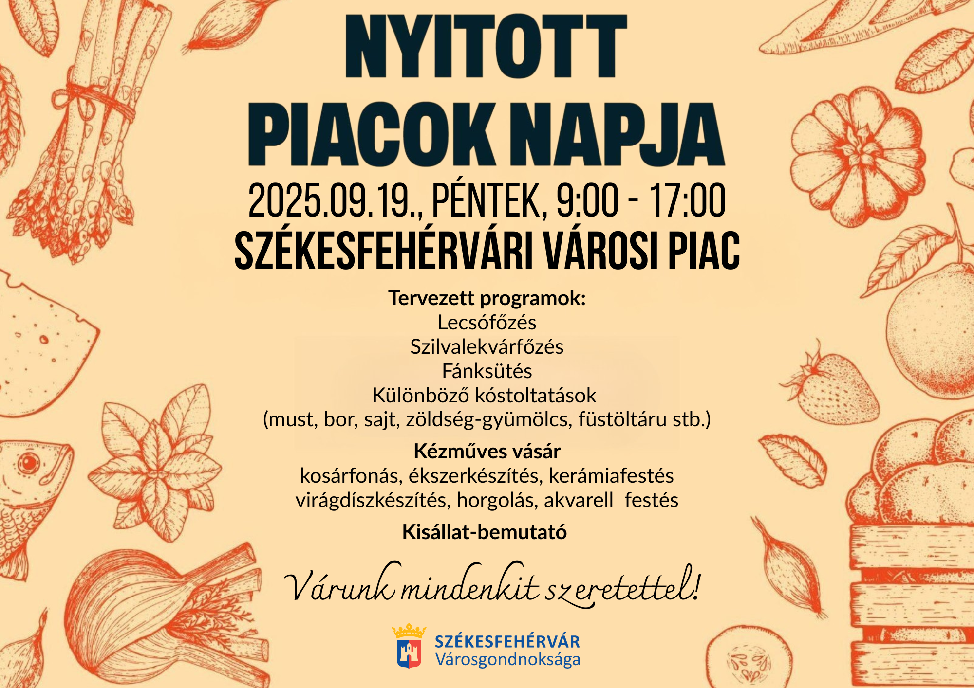 A Vásárcsarnokok és Piacok Együttműködési Fóruma idén szeptember végén rendezi a III. Nyitott Piacok Napja országos eseményt, amelyhez szeptember 19-én, pénteken a Székesfehérvári Városi Piac is csatlakozik. A piac mint találkozási pont tematika köré szerveződik az idei rendezvény, a Nyitott Piacok Napjának fókuszterméke pedig 2025-ben a lecsó és alapanyagai leszenek.