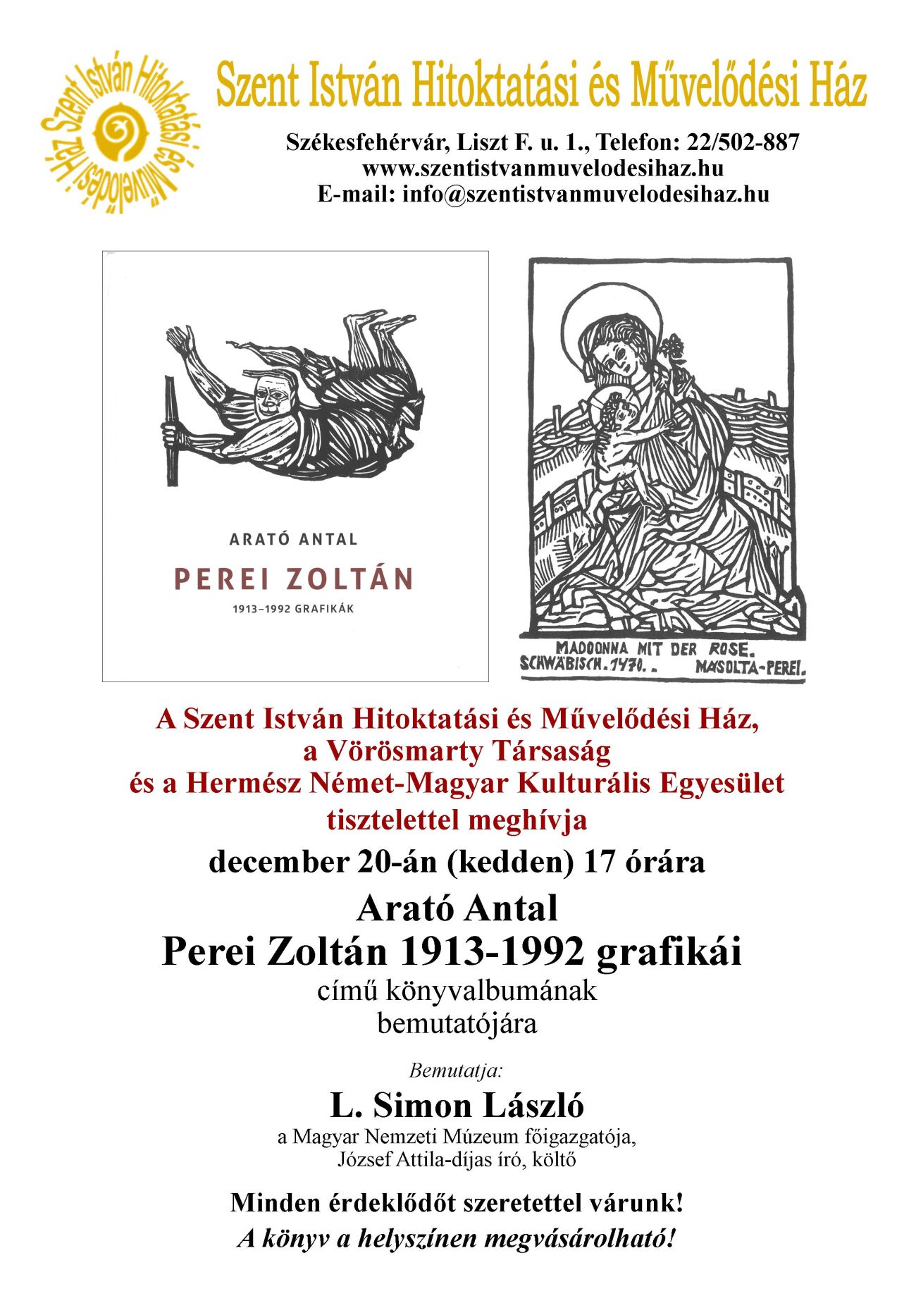 December 20-án kedden 17 órától mutatják be a Szent István Hitoktatási és Művelődési Házban Arató Antal könyvalbumát Perei Zoltán grafikái 1913-1992 címmel. Minden érdeklődőt szeretettel várnak, a könyv a helyszínen megvásárolható.