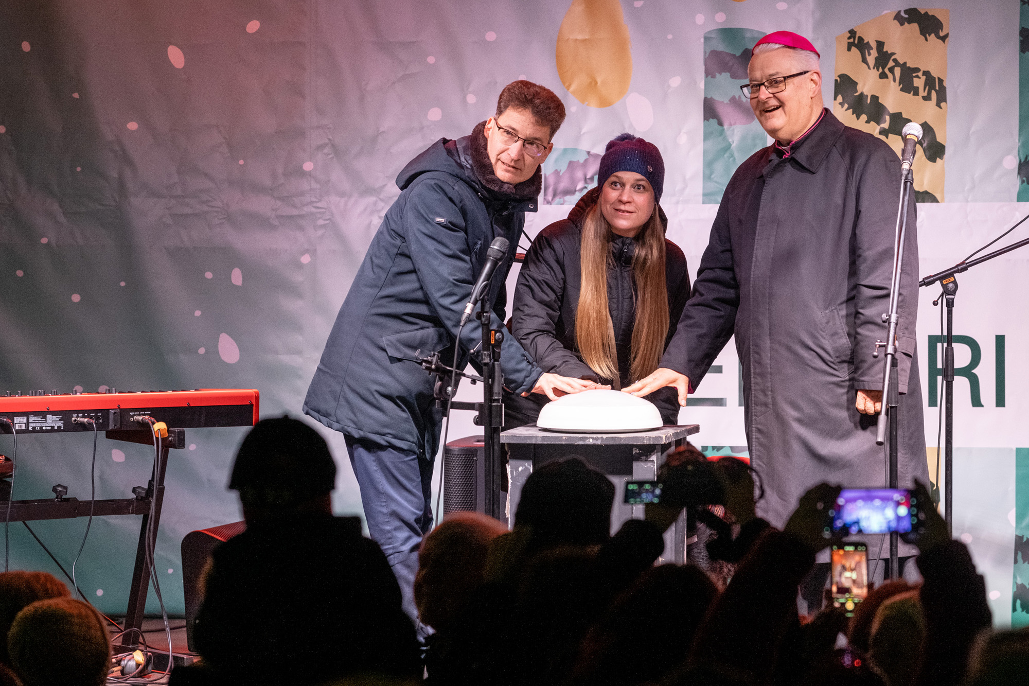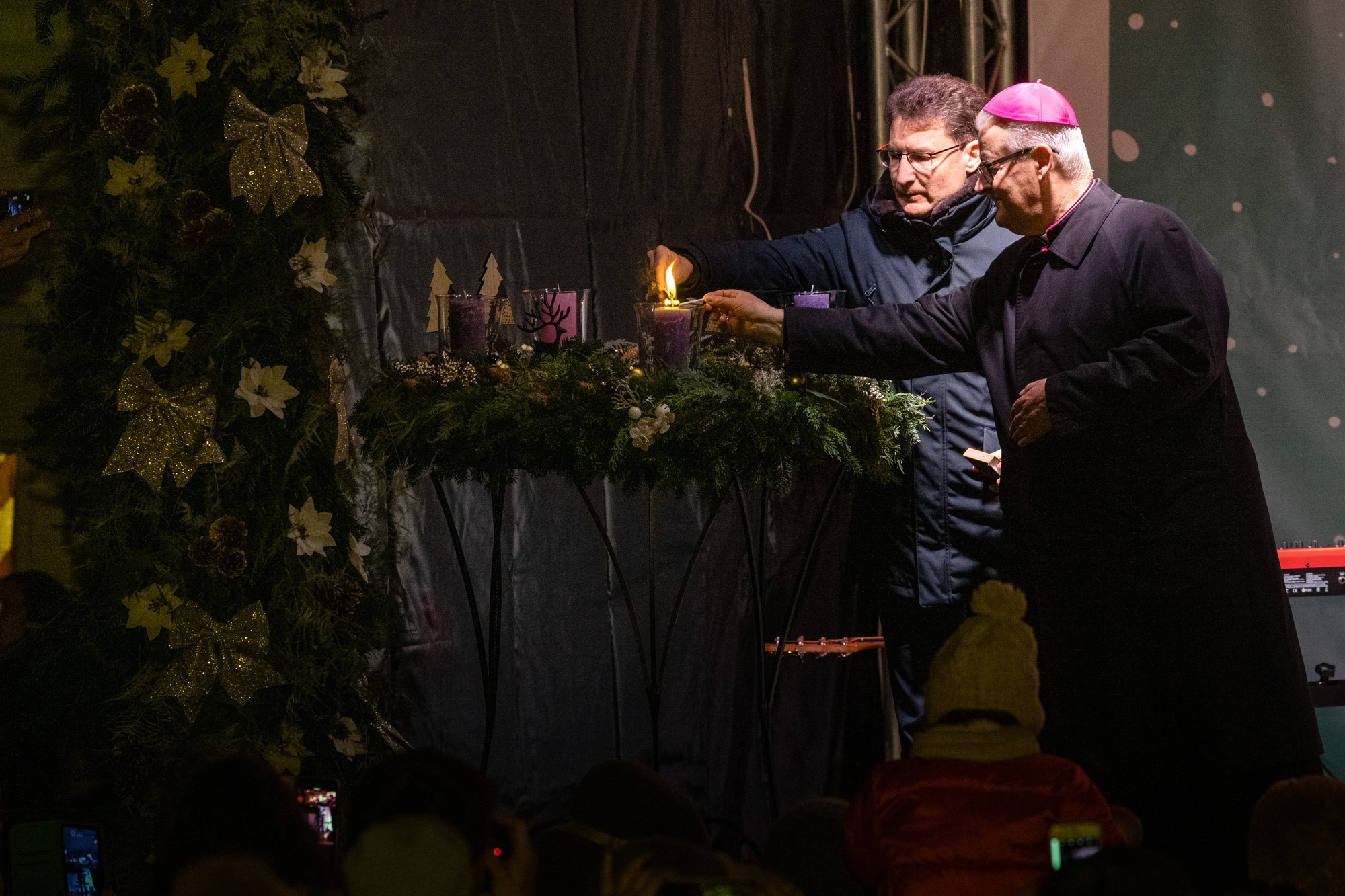A várakozás első gyertyáját a megyéspüspök és a város polgármestere közösen gyújtotta meg, majd felcsendült a Kisangyalok kórusának varázslatos éneke.