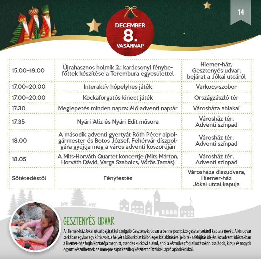 Advent második hétvégéjén is folytatódnak az ünnepváró programok Székesfehérvár díszbe öltöztetett Belvárosában. Vasárnap este a második adventi gyertyagyújtásra várják a családokat a Városház térre, ezúttal Róth Péter alpolgármester és Botos József, a város Díszpolgára gyújtja meg a második adventi gyertyát. Előtte Nyári Aliz és Nyári Edit, utána a Mits-Horváth Quartet koncertezik, de lesz élő adventi naptár és ünnepi fényfestés is.