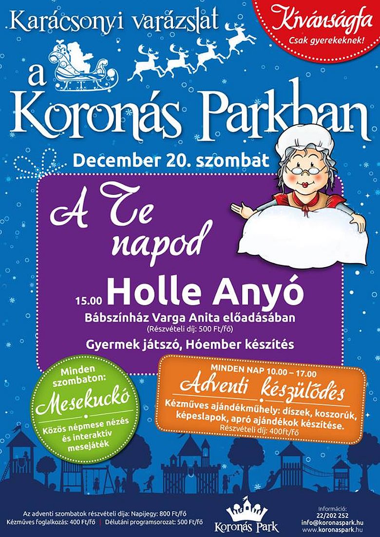 Advent utolsó, negyedik hétvégéjén is sok érdekességgel várják az érdeklődőket a fehérvári Koronás Parkban. December 20-án, szombaton Varga Anita előadásában láthatják a programon résztvevők a Holle Anyó című bábelőadást. A délután 15 órakor kezdődő eseményen 500 Forintos jegy megvásárlásával lehet részt venni. Ezen kívül kézműves foglalkozásokat és interaktív mesejátékokat is szerveznek a Koronás Parkban. A vasárnapi adventi gyertyagyújtásra 16 órakor kerül sor.