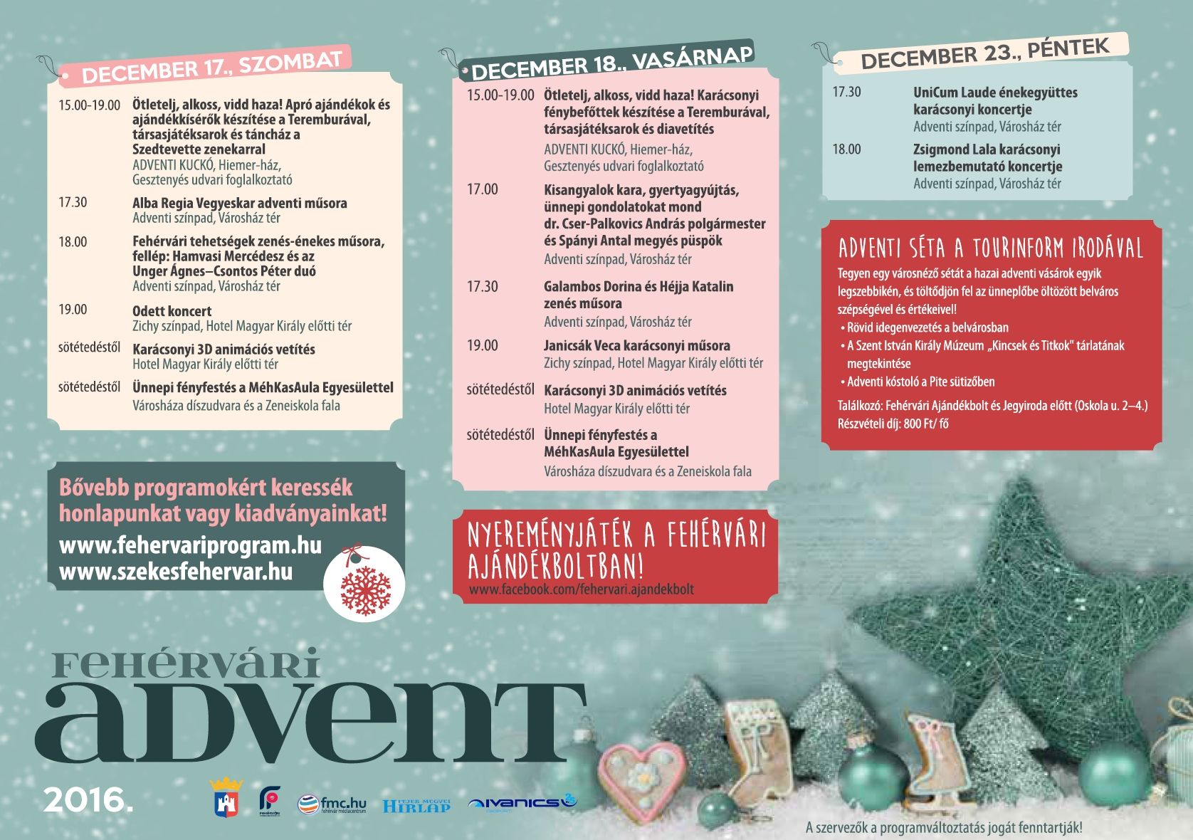 15.00 órakor kezdődik a Vízivárosi Advent 4. szombatjának programja a Vízivárosi Általános Iskolában, ahol Vargha Tamás honvédelmi államtitkár, Székesfehérvár országgyűlési képviselője és a városrész önkormányzati képviselője, dr. Horváth Miklósné mond köszöntőt, majd közösen gyújtják meg az adventi koszorú negyedik gyertyáját. Ünnepi gondolatait Berze János református lelkész is megosztja a jelenlévőkkel. A rendezvényre kicsiket és nagyokat, valamint a nyugdíjasokat is egyaránt várják. Koncertet ad Horváth Elemér hegedűművész és Horváth Péter zongoraművész, valamint fellép többek között Keller János és Váradi Eszter Sára is.