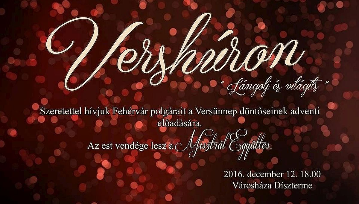A Vershúron –„Lángolj és világíts” című irodalmi est 2016. december 12-én, hétfőn 18.00 órakor kezdődik a Városháza Dísztermében. A hétfő esti adventi gálán Bakó Fanni, Börcsök Olivér, Ferenczy-Nagy Boglárka, Kertész Ádám, Körmendi Kristóf, Komlódy Márk, Koós Boglárka, Strasszer Domokos, Varga Eszter és Váradi Imre működnek közre, ahol a Misztral Együttes is fellép. Az est végén lehetőség lesz CD-vásárlásra a Misztral Együttes lemezeiből. Az ingyenes programra szeretettel várnak minden érdeklődőt a szervezők!