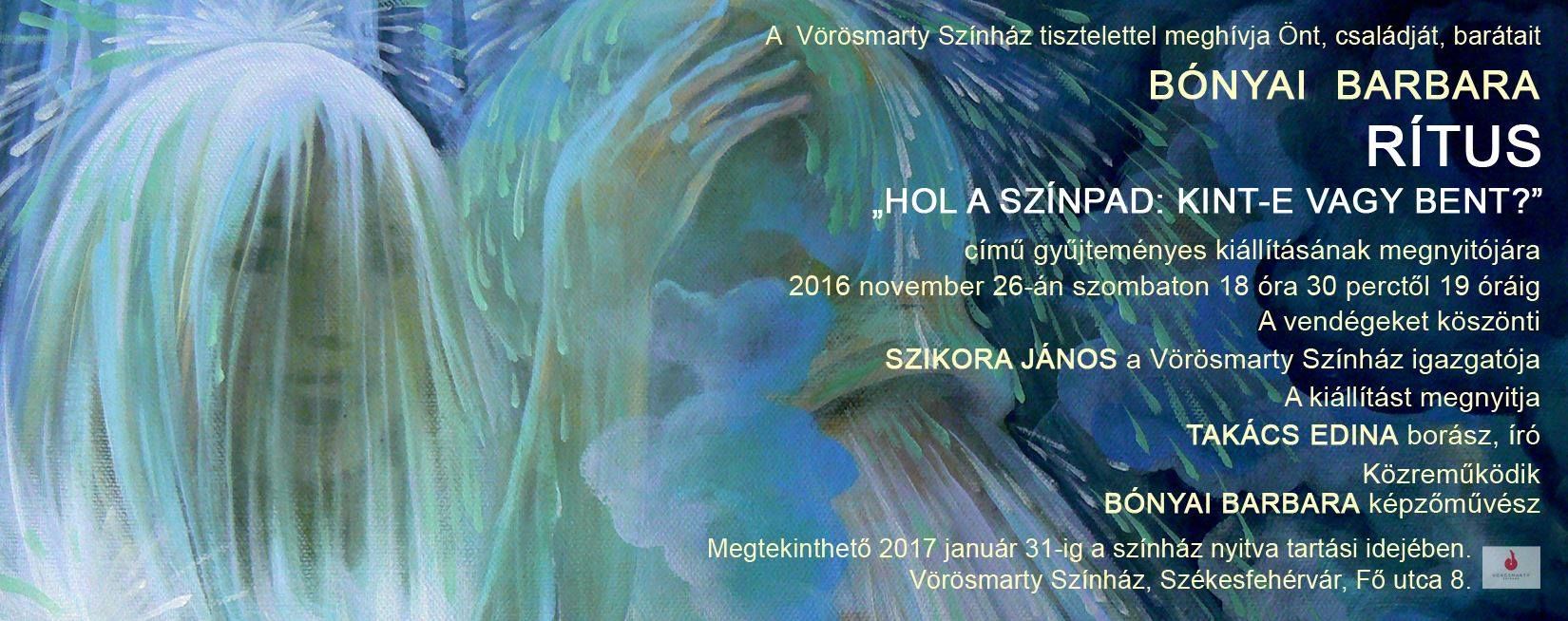 A színház galériájában nyílik meg november 26-án 18:30-tól Bónyai Barbara Rítus – Hol a színpad, kint-e vagy bent? című gyűjteményes kiállítása. A vendégeket dr. Szikora János köszönti, a kiállítást Takács Edina író, borász nyitja meg.