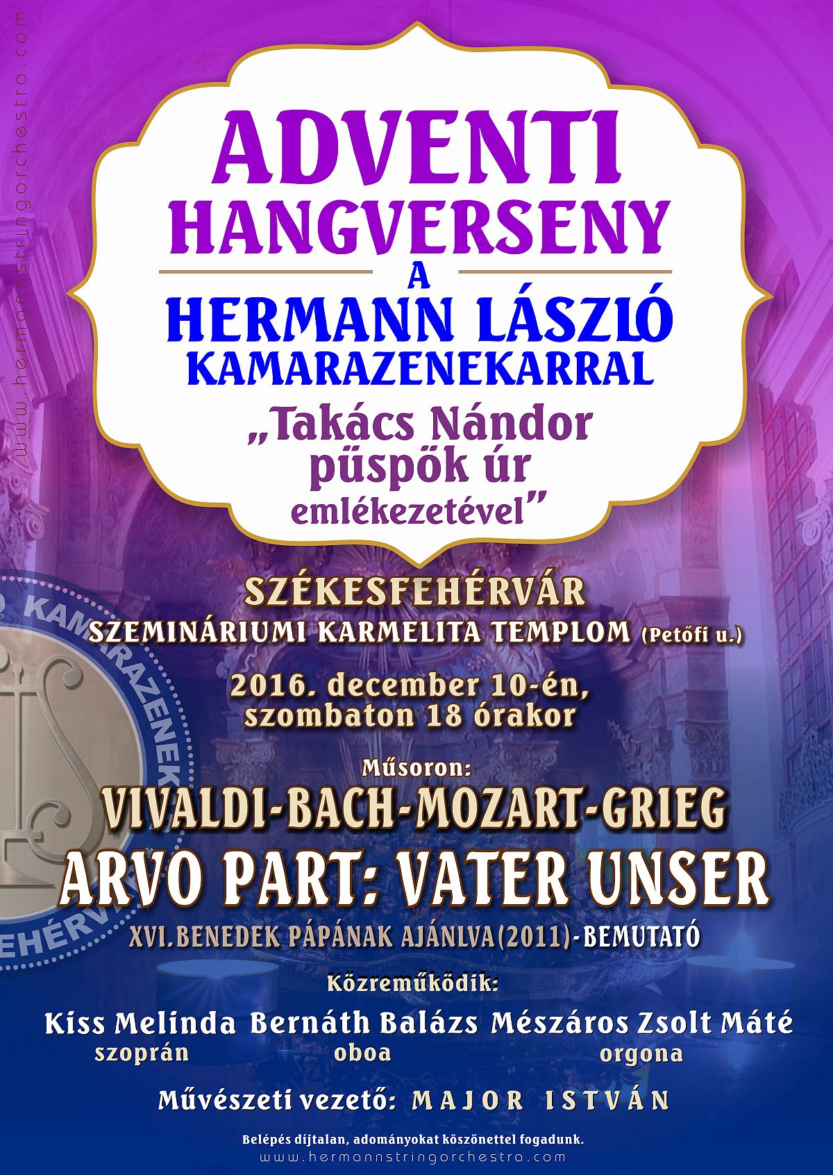 Adventi hangverseny lesz december 10-én, szombaton a Szemináriumi karmelita templomban a Hermann László Kamarazenekarral, Takács Nándor püspökre emlékezve. Az ünnepi koncerten Vivaldi, Bach, Mozart és Grieg dallamai csendülnek fel, valamint előadják Arvo Pärt észt zeneszerző Vater Unser című szerzeményét.