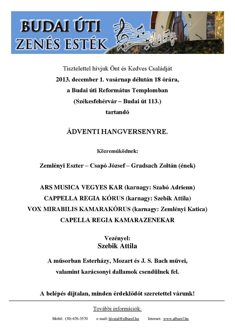 Ádventi hangversenyt rendeznek december 1-jén, vasárnap 18 órától a Budai úti Református Templomban. A műsorban Szebik Attila vezénylésével Esterházy, Mozart és J. S. Bach művei, valamint karácsonyi dallamok csendülnek fel. Az eseményre a belépés díjtalan, a szervezők minden érdeklődőt szeretettel várnak!