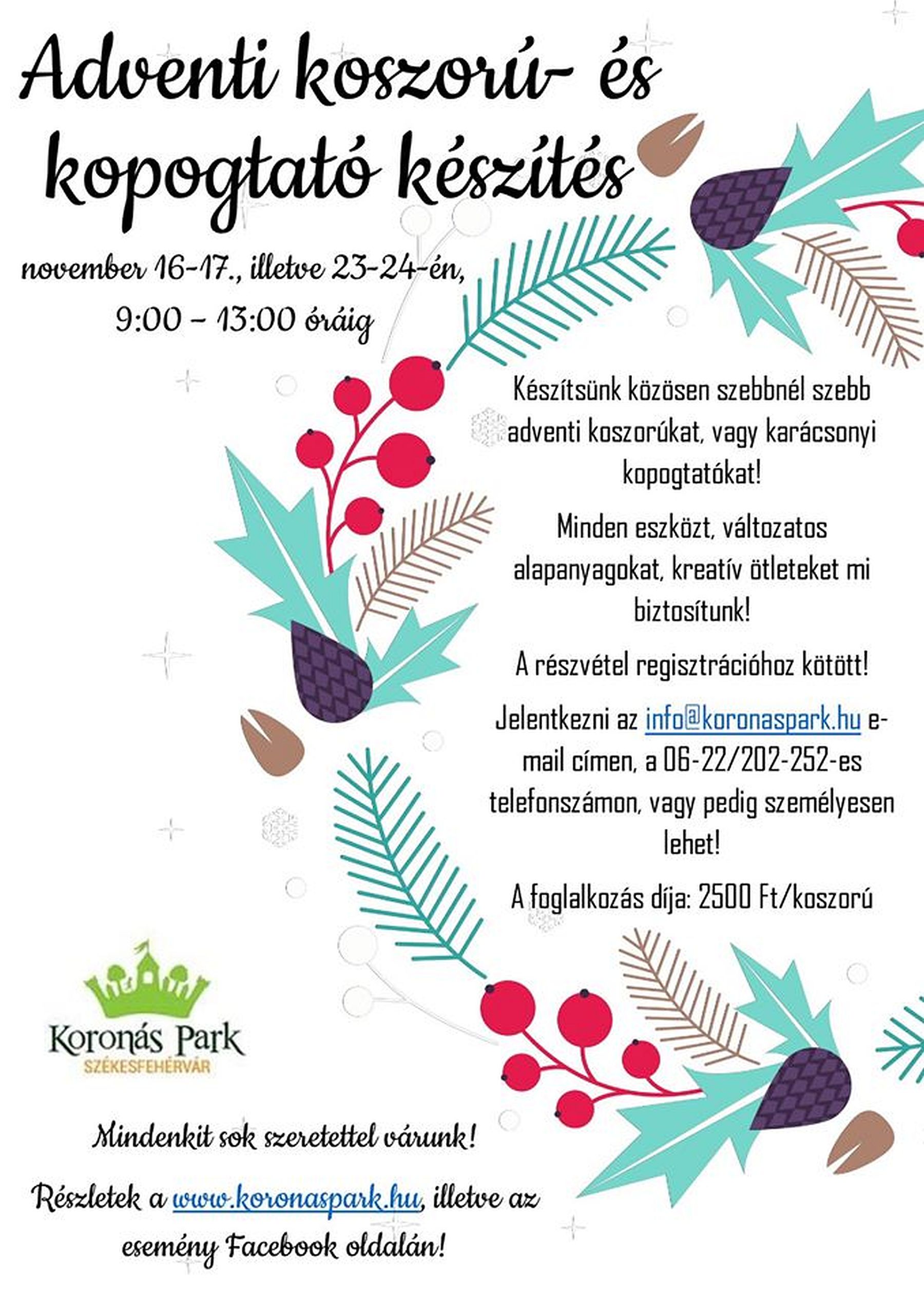 November 16-án és 17-én, szombaton és vasárnap délelőtt 9-13 óráig adventi koszorúkészítésre várják az érdeklődőket a Koronás Parkba. Előzetes jelentkezés személyesen a Koronás Park főépületében, az info@koronaspark.hu e-mail címen, vagy a 0622/202-252-es telefonszámon. Részvételi díj: 2500 Ft/koszorú.