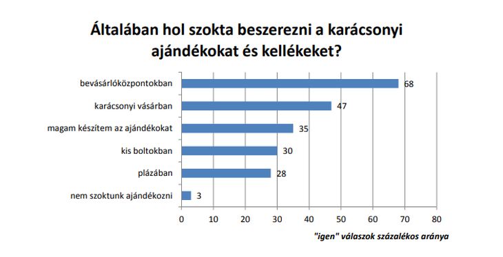 A fehérváriak leginkább a bevásárlóközpontokat preferálják. Karácsonyi vásárban 47 százalékuk, kis boltokban 30 százalékuk, plázában 28 százalékuk vásárol. A válaszadó lakosok harmada pedig maga készít is ajándékokat.