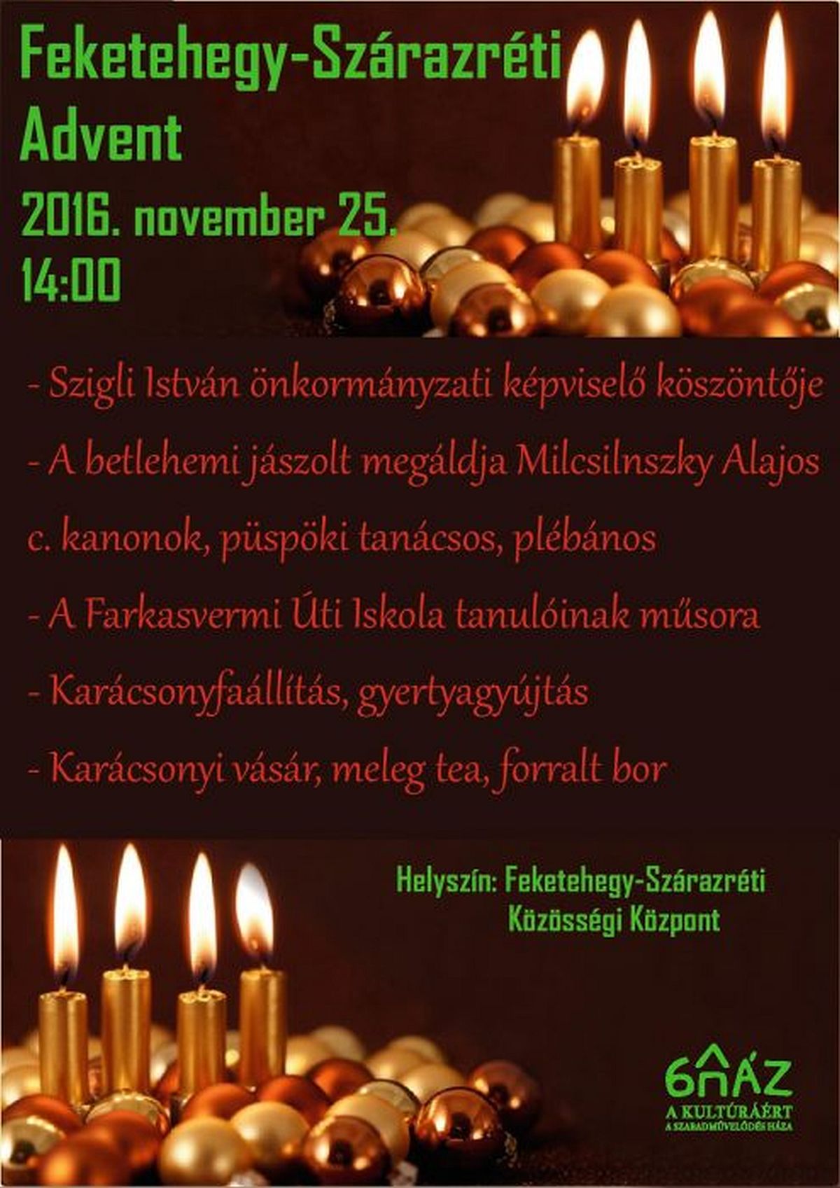 Adventi ünnepséget rendeznek a Feketehegy-Szárazréti Közösségi Központban november 25-én, pénteken 14 órakor. A betlehemi jászolt Milcsinszky Alajos plébános áldja meg, majd a Farkasvermi úti tagiskola diákjai adnak műsort. A programot karácsonyi vásár színesíti. A feldíszített karácsonyfa és a gyertyák mellett alkalom nyílik egy bensőséges beszélgetésre is, a lakosokat meleg teával, forralt borral várják. Az ünnepi esemény résztvevőit Szigli István önkormányzati képviselő köszönti.