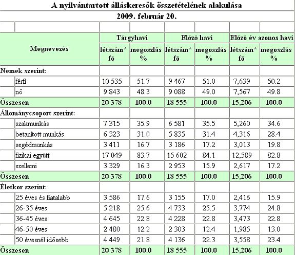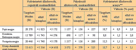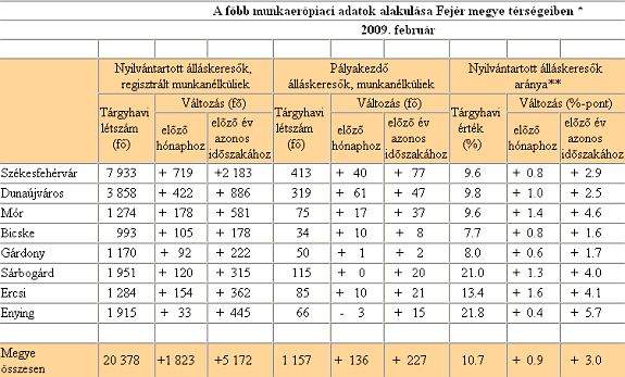 Idén február végén az álláskeresők száma 20378 fő volt a megyében, ami az előző havinál 1823 fővel (9,8%-kal), az egy évvel korábbinál 5172 fővel (34,0%-kal) több. Az ugrásszerű növekedés oka a pénzügyi és gazdasági válságra vezethető vissza, a szezonalitás a növekedésnek csak a töredékét indokolja. A régió álláskeresőinek 38,0%-a található Fejér megyében.