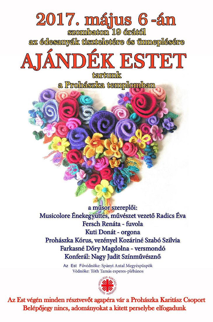 Az édesanyák tiszteletére szervez Ajándék Estet a Prohászka Karitász Csoport május 6-án, szombaton 19 órai kezdettel a Prohászka templomban. A rendezvény fővédnöke Spányi Antal megyés püspök, védnöke Tóth Tamás esperes-plébános.