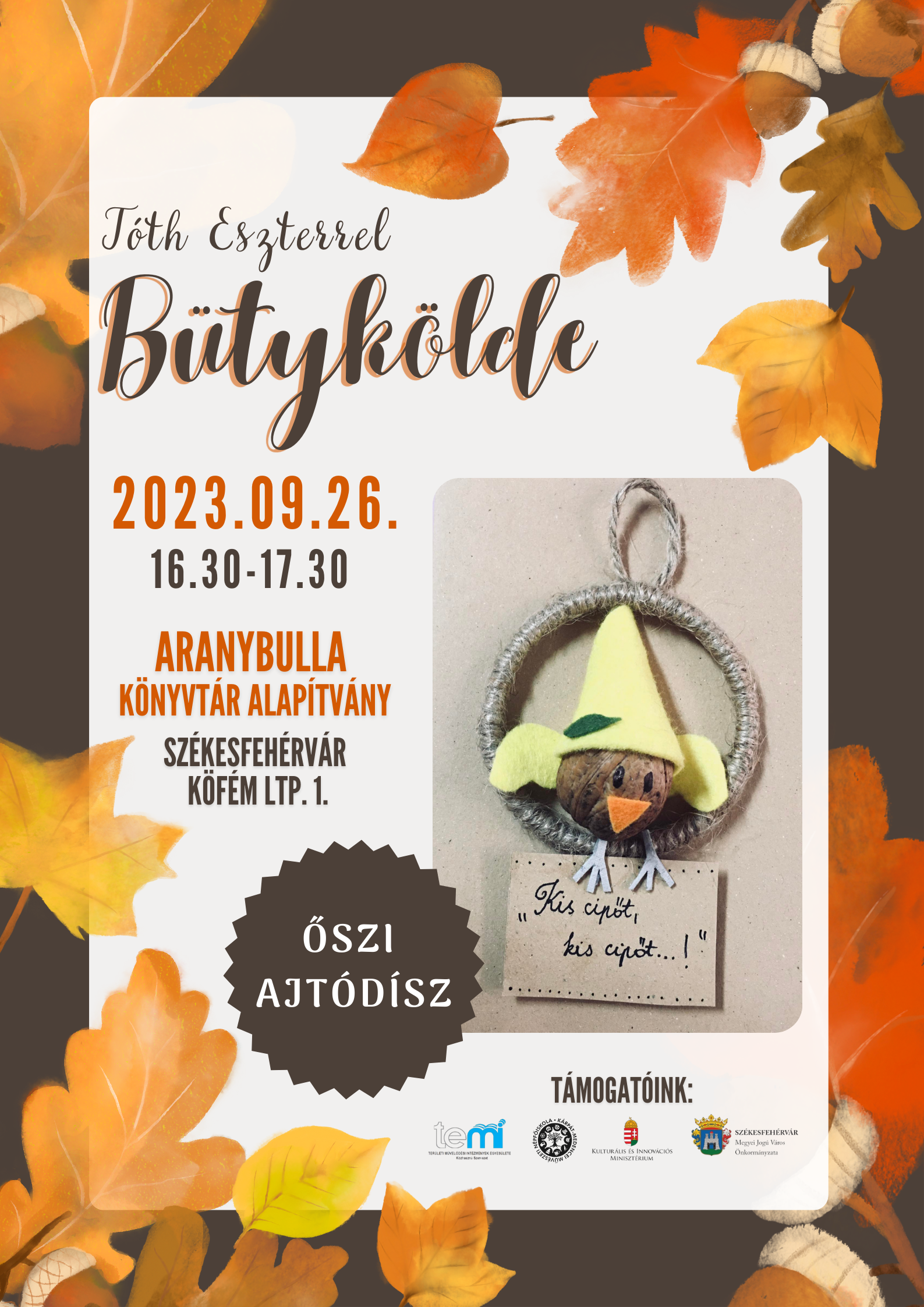 A szeptember 26-i, keddi Bütyköldéhez Móra Ferenc A cinege cipője című verse adja az ihletet. A programon őszi ajtódíszeket készítenek a résztvevők Tóth Eszter vezetésével.