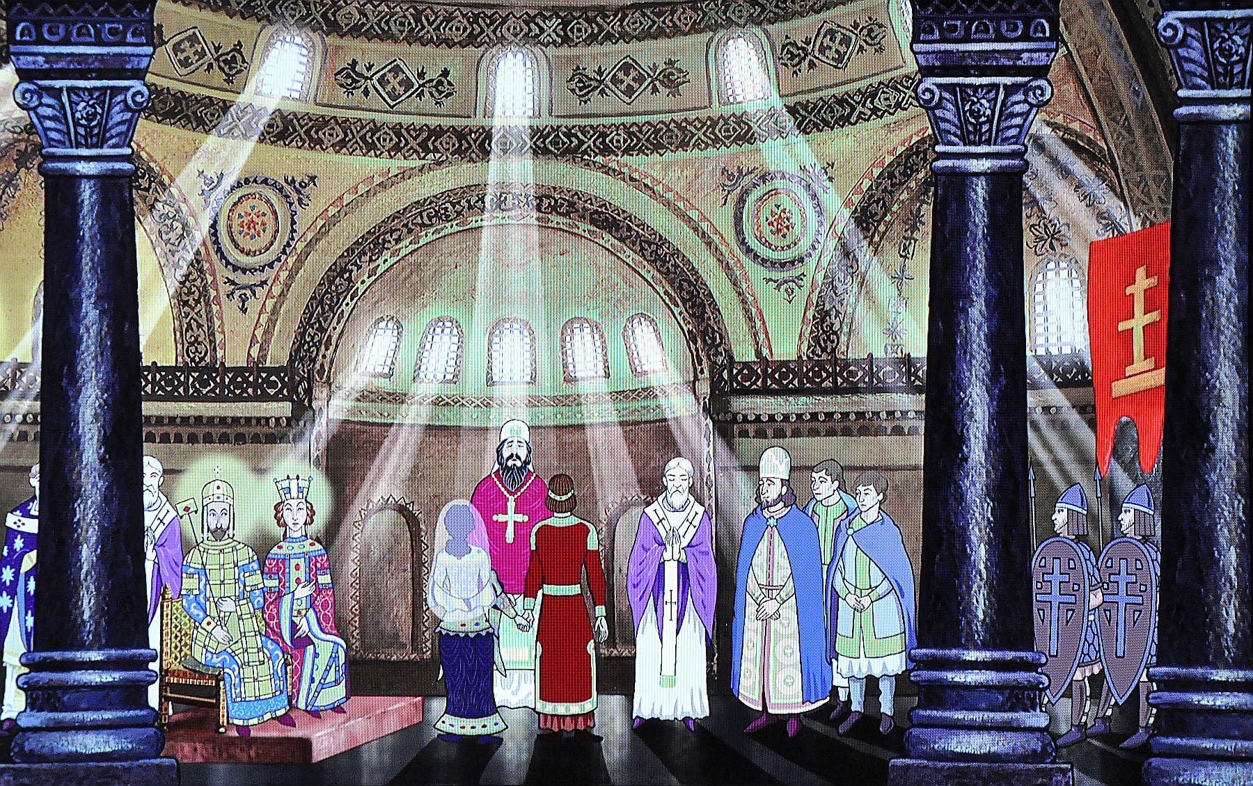 „A címben szereplő uralkodók életének egy bizonyos szakaszában úgy látszott, akár császár is válhat belőlük: Béla Keleten – mint Bizánc császárságának örököse –, Mátyás pedig Nyugaton.” - mondta köszöntőjében a házigazda, Kulcsár Mihály, a Szent István Király Múzeum igazgatója, majd levetítették Jankovics Marcell „Az Árpádok emlékezete - keresztesek Magyarországon” című animációs filmjének második részét. (Az animációs film a kiállítás látogatása alkalmával megtekinthető.)
