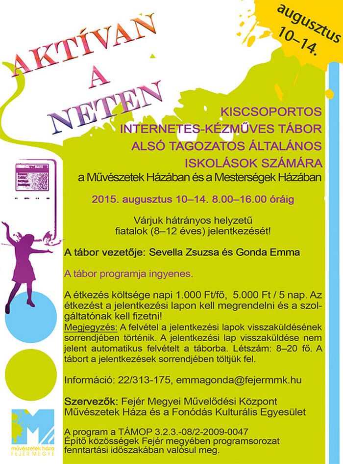 Aktívan a neten címmel internetes kézműves tábort hirdettek alsó tagozatos általános iskolások számára a Művészetek Házában és a Mesterségek Házában. Augusztus 10-e és augusztus 14-e között, 8 és 16 óra között várják a hátrányos helyzetű fiatalok jelentkezését. A táborral kapcsolatos információkat a 22/313-175-ös telefonszámon, vagy a emmagonda@fejermmk.hu e-mail címen kaphatnak az érdeklődők.