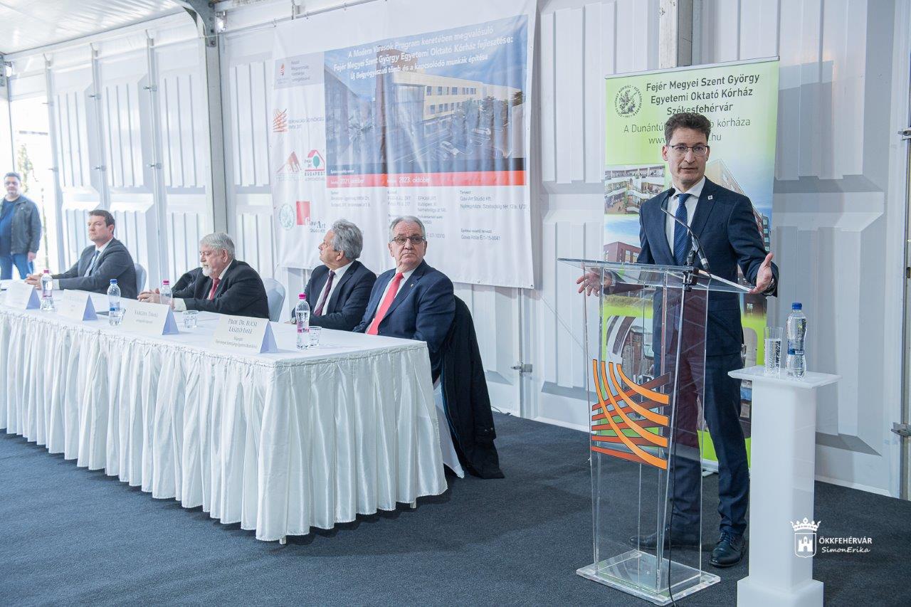 „Miden ilyen fejlesztés szívét alapvetően azok az emberek adják meg, akik a kórházban dolgoznak. Az intézmény szakmai munkáját ezekkel az infrastruktúra fejlesztésekkel tudjuk támogatni.” – kezdte köszöntőjét dr. Cser-Palkovics András. Székesfehérvár polgármestere kiemelte, a város segítségére minden időben számíthat a kórház, hiszen rengeteg olyan dolgot tesznek közösen, amelyek a régió egészét meghatározó egészségügyi ellátás fejlesztését jelenti. Emlékeztetett: bár a kétezres évek elején a fehérvári kórház máig érthetetlen módon kimaradt a Pólus Programból, 2010-től a város és a kórház vezetői az országgyűlési képviselőkkel közösen azon dolgoztak, hogy ezt pótolni tudják, és azt a két hiányzó tömböt, és annak teljes eszközparkját meg tudják valósítani. Ennek egyik eleme volt a 2014-ben átadott központi műtő és intenzív részleg, a másik elem építése most kezdődik el. Székesfehérvár Modern Városok Programjának keretében. E program tette lehetővé a parkolóbővítést és a légtechnikai korszerűsítést azokban az épületekben, ahol erre már nagy szükség van. A polgármester beszéde végén egy kéréssel fordult a szakemberek felé: „A kórházzal közösen, sok egyéb mellett van még egy közös kihívásunk: az ápolási osztály épületének felújítása. A Modern Városok Program keretében látjuk azt a forrást, amelynek az átcsoportosításával, és ehhez kérem a minisztérium támogatását, a város segítheti majd ennek a beruházásnak a megvalósítását.”