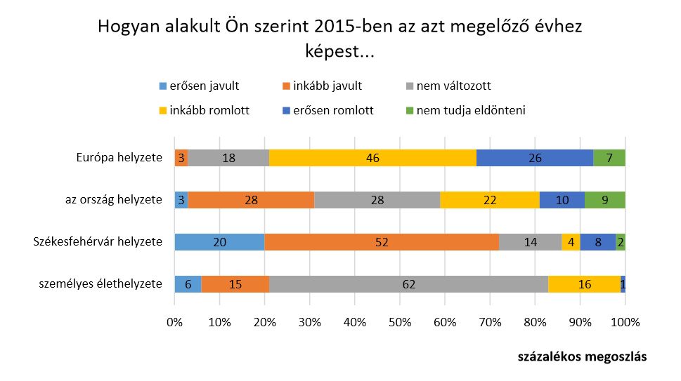 A kutatásban arra voltak kíváncsiak, hogy az emberek hogyan értékelték az elmúlt évet az azt megelőzőhöz képest. A megkérdezett válaszadók 46 százaléka vélte úgy, hogy Európa helyzete inkább romlott 2015-ben 2014-hez képest, 26 százalékuk szerint pedig erősen romlott. A kontinens helyzetét változatlannak tartja 18 százalék, 7 százalék pedig bizonytalan a kérdést illetően. Az ország helyzetével kapcsolatban valamivel pozitívabban értékelték a válaszadók az elmúlt évet, 3 százalékuk szerint erősen javult, 28 százalékuk szerint pedig inkább javult az ország helyzete 2015-ben az azt megelőző évhez képest. Inkább romlónak, vagy erősen romlónak összesen a válaszadók 32 százaléka ítéli a helyzetet, míg 9 százalékuk nem tudott választ adni a kérdésre.