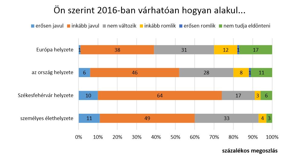 Az elmúlt évről, és a fehérváriak 2016-ra vonatkozó elvárásairól készített felmérést az Echo Szociológiai Kutatóintézet. A kutatásból kiderült, hogy a megyeszékhelyen élők úgy érzik hogy javult mind a város, mind pedig az ország helyzete az elmúlt évben és hasonló várakozással takintenek 2016-ra is. Székesfehérvár helyzetével kapcsolatban nagyon pozitívan vélekednek a lakosok. 2015-ben 72 százalékuk szerint javult, vagy jelentősen javult a város helyzete 2014-hez képest.