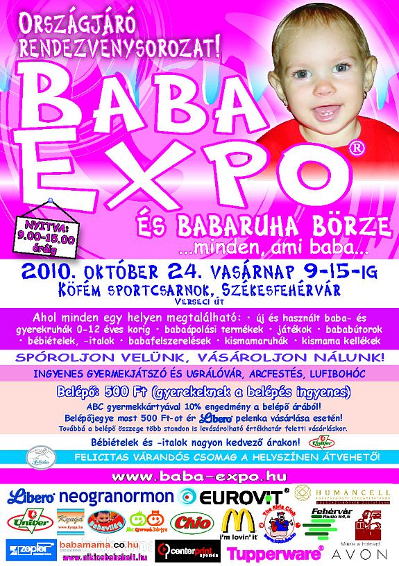 Baba Expót tartanak október 24-én vasárnap a Köfém Sportcsarnokban. Az országjáró rendezvénysorozat nem csak a babaholmikról szól, játszósarok is várja a gyerekeket, ahol ugrálóvár, arcfestés és lufibohóc áll a családok rendelkezésére. A belépő 500 Forint, ami levásárolható több standon is. Új és használt gyermekruhákat, babaápollási termékeket, bababútorokat és játékokat is kínálnak majd a rendezvényen.