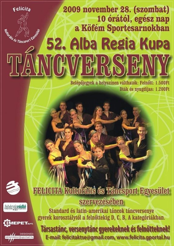 Az 52. Alba Regia Kupán délelőtt 10 órától kezdve gyönyörködhet a közönség a keringőt és tangót lejtő, cha cha cha és szamba ritmusára riszáló párok látványában, akik a gyerektől a felnőtt korosztályig minden szinten, D, C, B és A kategóriában is megméretik magukat. A szervezést ezúttal is a Felicita KTSE vállalta magára, az Öreghegyi, Felsővárosi és Kisfaludi Közösségi Házzal együttműködésben, a technikai hátteret pedig a Szabadművelődés Háza biztosítja.