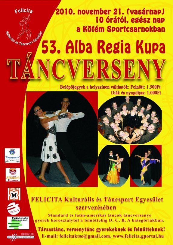 Vasárnap, november 21-én délelőtt 10 órától a Köfém Sportcsarnokban rendezi a Felicita Táncsport Egyesület az 53. Alba Regia Kupa Táncversenyt. A standard és latin-amerikai táncok versenye mellett korosztályos A, B, C, D kategóriás versenye is lesz. A szervezők mindenkit szeretettel várnak: felnőteknek 1500, diákoknak és nyugdíjasoknap pedig 1000 Forint a belépőjegy.