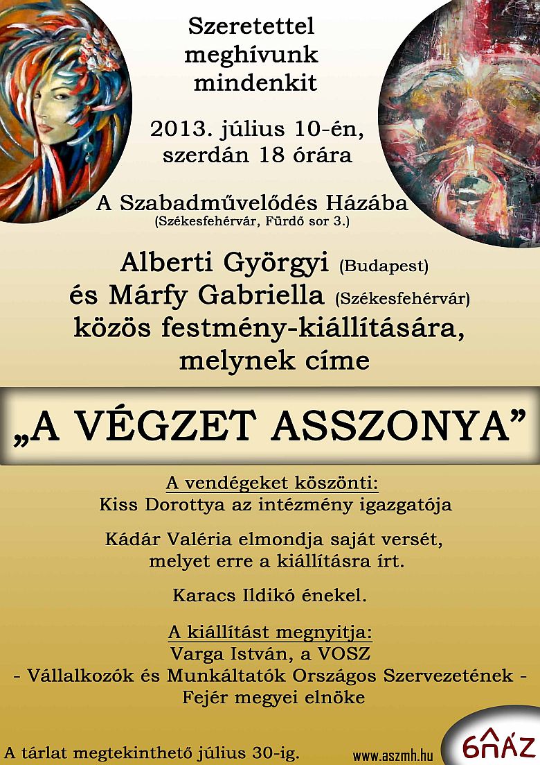 Szerdán este hat órakor nyílik meg Albert Györgyi és Márfy Gabriellla közös festmény kiállítása a Szabadművelődés Házában "A végzet asszonya" címmel. A vendégeket Kiss Dorottya a ház igazgatója köszönti és Varga István a VOSZ Fejér megyei elnöke nyitja meg. A tárlat július 30-ig tekinthető meg.