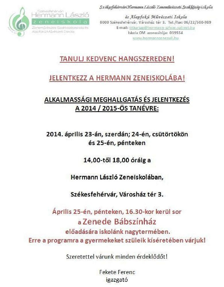 A Hermann László Zeneiskolában alkalmassági meghallgatást és jelentkezést tartanak 2014. április 23-án, 24-én és 25-én délután 14-től 18 óráig az előképző, illetve a hangszeres első osztályokba jelentkezőknek a 2014/2015-ös tanévre. Április 25-én, pénteken a Zenede Bábszínház előadását is megtekinthetik az érdeklődők az iskola nagytermében. A programokra mindenkit szeretettel várnak a Városház tér 3. szám alatt található intézménybe.