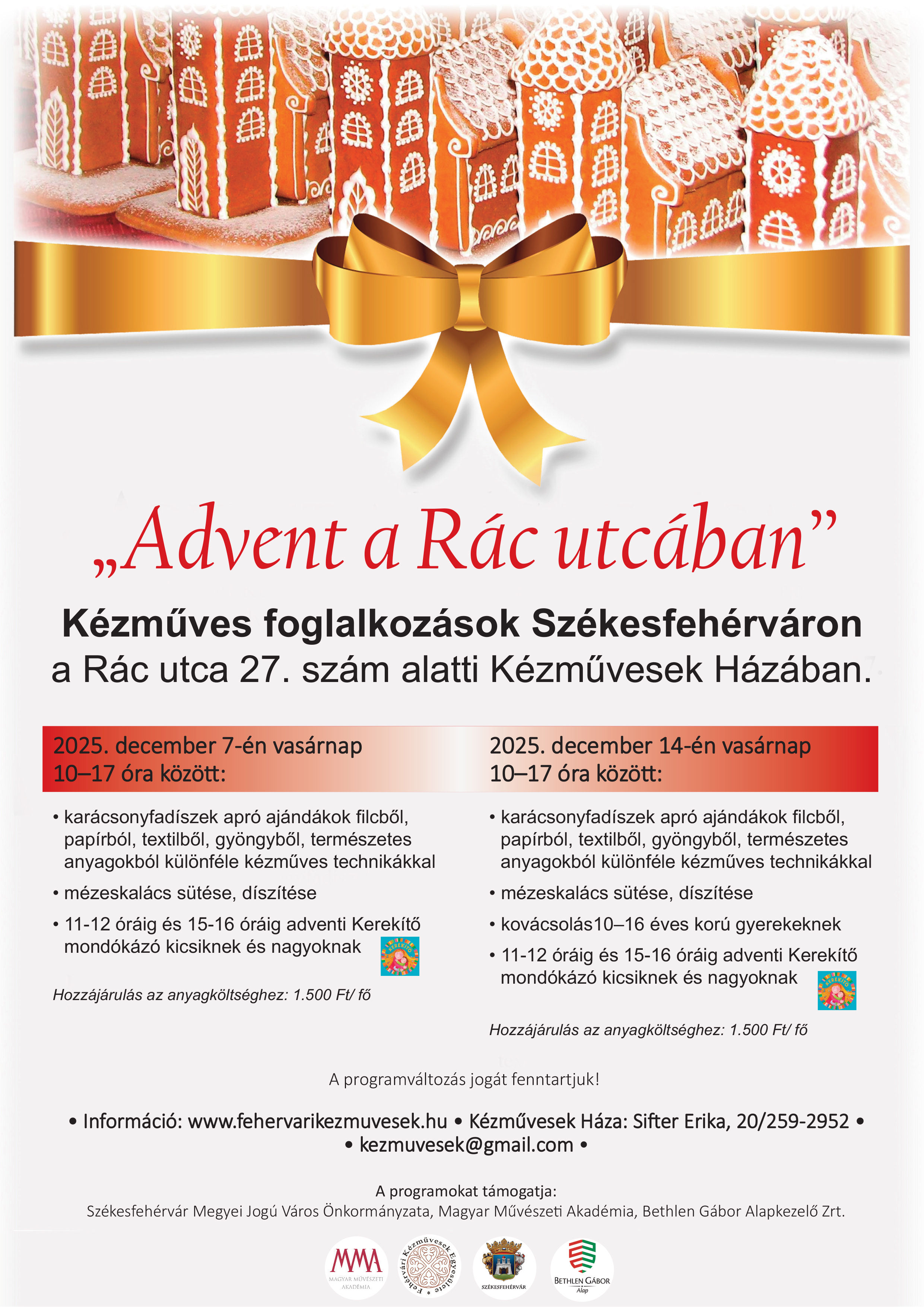 Ugyancsak hagyomány az Advent a Rác utcában című kreatív programsorozat, melyet idén december 7-én és 14-én, vasárnapi napokon 10.00 és 17.00 óra között tartanak a Kézművesek Házában.