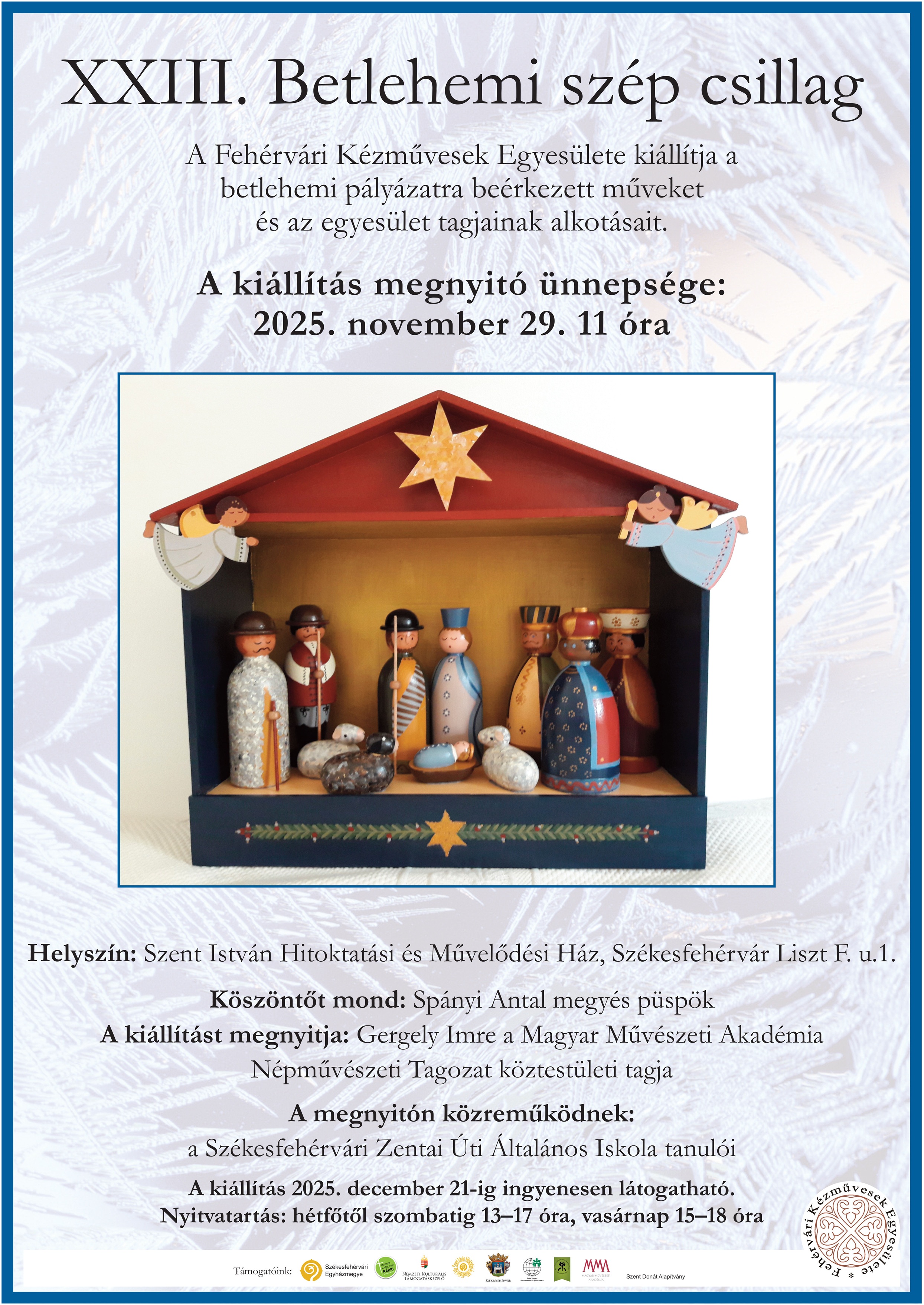 November 29-én, szombaton 11.00 órakor nyílik meg a XXIII. Betlehemi Szép Csillag pályázatra beérkezett alkotások kiállítása a Szent István Hitoktatási és Művelődési Ház Szent Korona Galériájában.