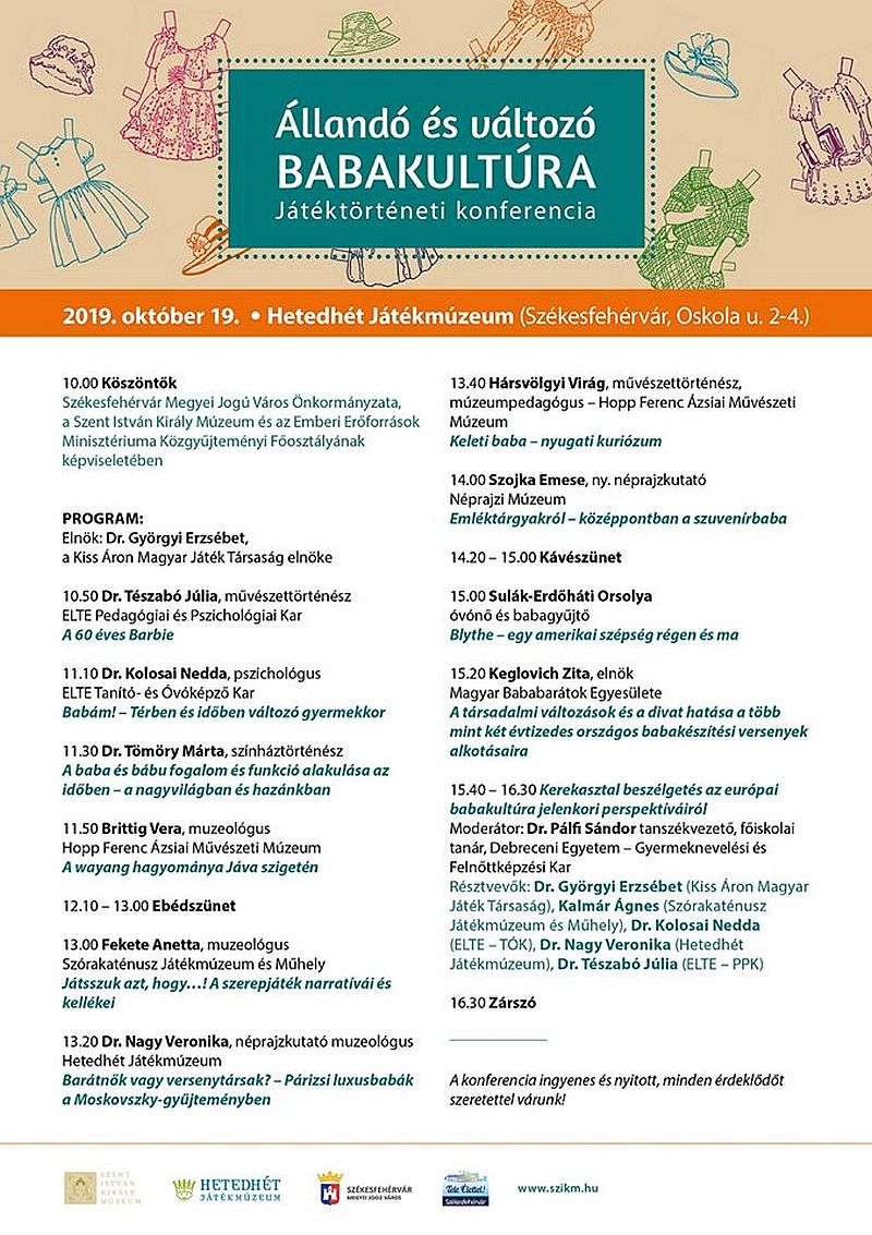 A Moskovszky Éva emlékére rendezett játékkonferencia minden évben rendkívül színvonalas és hasznos programokat tartalmaz. Idén október 19-én, szombaton 10 órától az állandó és változó babakultúra lesz a téma. A nap során többek között a Barbie baba hatvan éves történetéről, a térben és időben változó gyermekkorról, a szerepjátékokról, a Moskovszky-gyűjteményben látható párizsi luxusbabákról, valamint a keleti babákról és a különleges amerikai szépségről, a nagy szemű Blythe baba történetéről is érdekes előadásokat hallhatnak az érdeklődők.