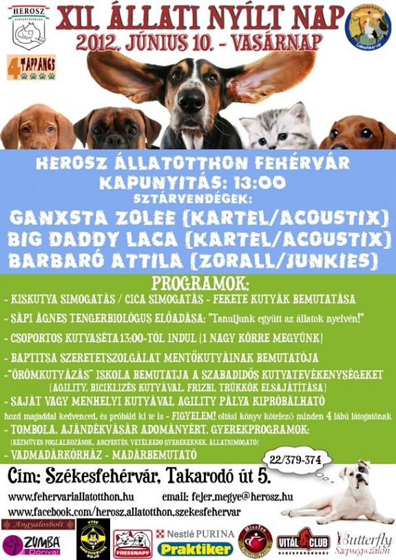 Vasárnap már tizenkettedik alkalommal szervezi meg nyílt napját az idén húsz éves székesfehérvári Herosz Állatotthon. Az érdeklődők megismerhetik a menhely lakóit, működését, a Vadmadárkórház munkáját és különféle bemutatókat tekinthetnek meg. Ismét ellátogatnak a rendezvényre Ganxsta Zolee és barátai, filmvetítéssel egybekötött előadást tart Sápi Ágnes világhírű tengerbiológus az állatoknál alkalmazható tréning módszeréről.