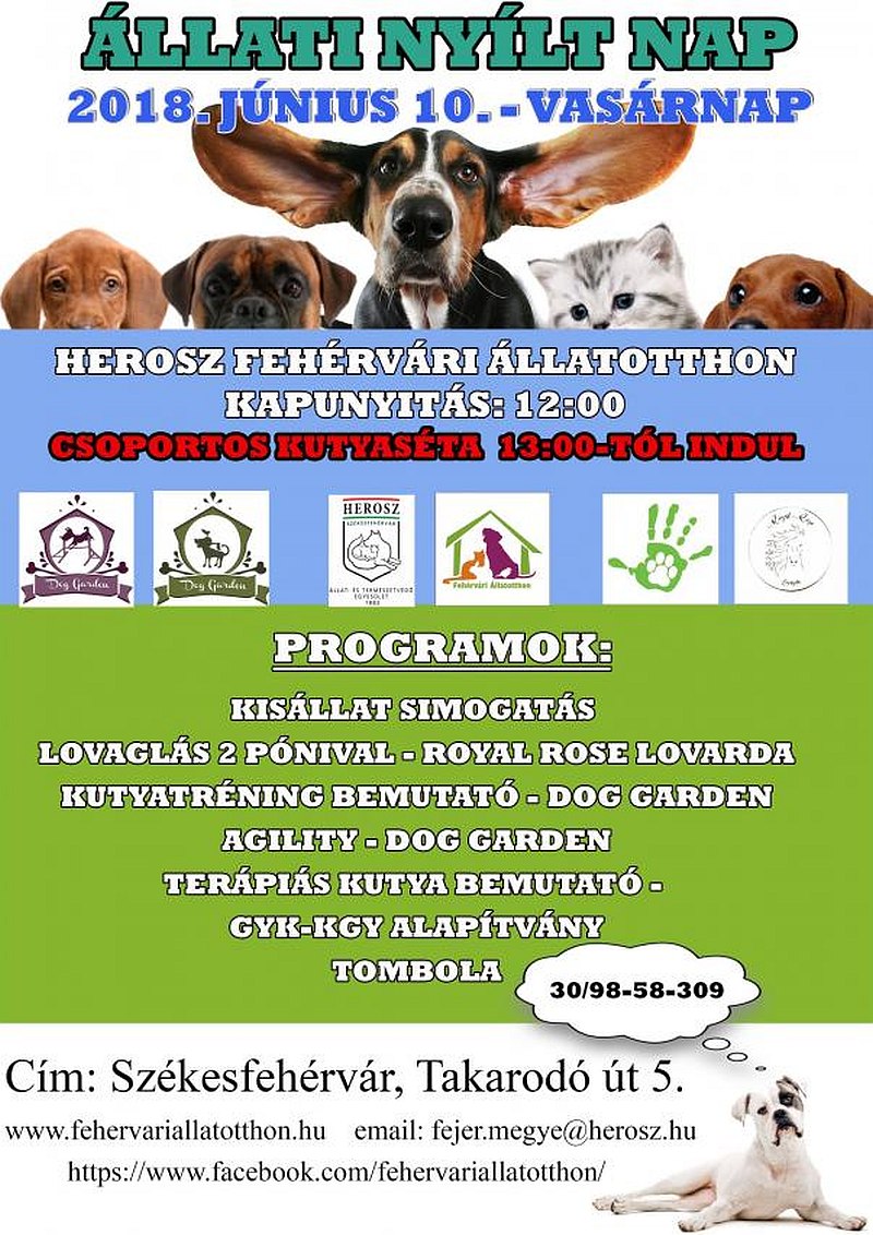 Vasárnap délután tartja éves nyílt napját a HEROSZ Fehérvári Állatotthona. Az állati jó programra szeretettel várják a gyerekeket, a családokat 12.00 és 17.00 óra között. A programra ingyenes a belépés!