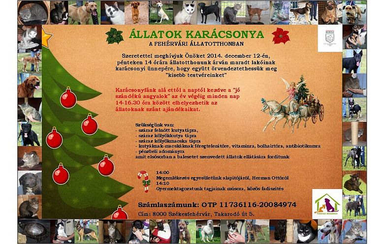 Hagyományos karácsonyi ünnepségét tartja december 12-én, pénteken délután a Fehérvári Állatotthon. A népszerű, évek óta sok-sok látogatót vonzó program után rendezik a HEROSZ Fejér Megyei Szervezetének évzáró taggyűlését. A karácsonyi ünnepség után 17 órától tartják a HEROSZ Fejér Megyei Szervezetének évzáró taggyűlését. Beszámolnak a szervezet idei tevékenységéről és jövő évi terveiről, fontos feladatairól is.