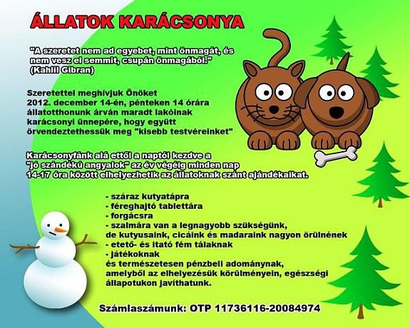 Ismét megünnepli az Állatok Karácsonyát az idén 20 éves székesfehérvári Herosz Állatotthon. December 14-én, pénteken a délutáni órákban szeretettel várnak minden önkéntest és érdeklődőt, akik az ünnepség után részt vehetnek a Herosz évzáró taggyűlésén is. 2012. január 1-je és november 30-a között 567 kutyának és 137 cicának talált új otthont a Herosz.