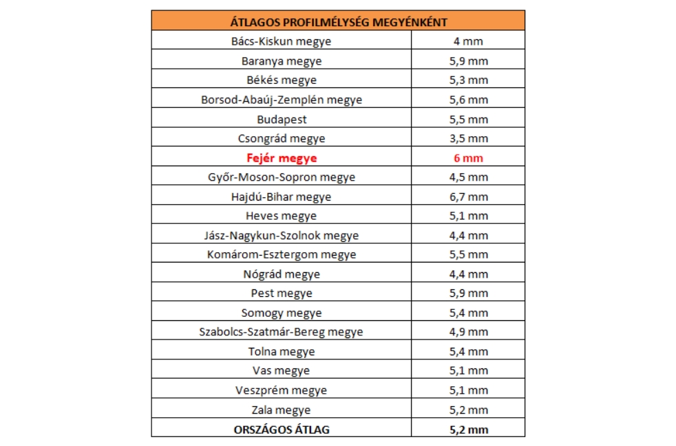 A téli gumiabroncs használatát a téli hónapokra kötelezően előíró országok jellemzően 4 mm-ben határozzák meg a minimális profilmélységét. A Téligumi Kommandó ellenőrzései szerint a hazai autók 5,2 milliméteres átlagos profilmélységű abroncsokon futottak, viszont tapasztaltak durvább szélsőségeket is. A legalacsonyabb, 3,5 mm-es átlagos profilmélységet Csongrád megyében látták, ami azt jelenti, hogy ott az autók zöme már bőven cserére érett abroncsokkal fut. Nem sokkal volt jobb a helyzet Bács-Kiskun megyében (4 mm) és Nógrád megyében (4,4 mm) sem.