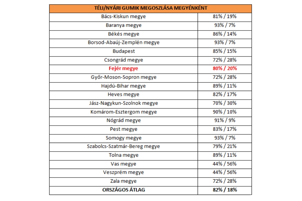 A Téligumi Kommandó megyei eredményeit nézve a legjobb téligumi-arányt Baranya, Borsod-Abaúj-Zemplén és Somogy megye mutatta, míg a legalacsonyabb, 44-44 százalékos adatot Vas és Veszprém megyében regisztráltak.