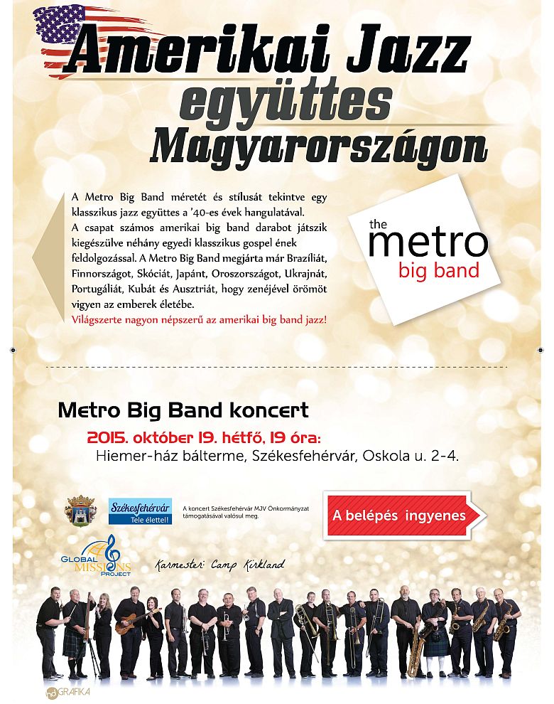 A műfaj őshazájából érkező Metro Big Band megjárta már Brazíliát, Finnországot, Skóciát, Japánt, Oroszországot, Ukrajnát, Portugáliát, Kubát és Ausztriát, hogy zenéjével örömöt vigyen az emberek életébe. Az október 19-i, hétfő esti ingyenes fehérvári koncerten nemcsak a jazz kedvelt melódiái csendülnek fel, hanem a mára már világszerte népszerű gospelből is ízelítőt kaphatunk a Hiemer-házban.