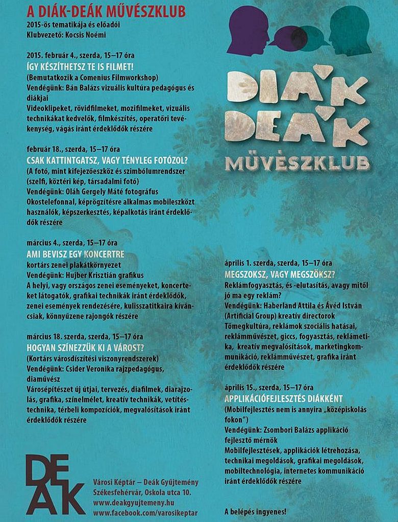 2015. március 4-én, szerda délután 15 órától kezdődik a Városi Képtár – Deák Gyűjtemény új programjának, a „Diák-Deák Művészklub” harmadik előadása. A kulturális programon a 15-18 év közötti középiskolásoknak szóló esemény harmadik alkalmán Hujber Krisztián grafikus avatja be az érdeklődőket a grafika rejtelmeibe. Az ingyenesen látogatható klubfoglalkozás vezetője Kocsis Noémi lesz.