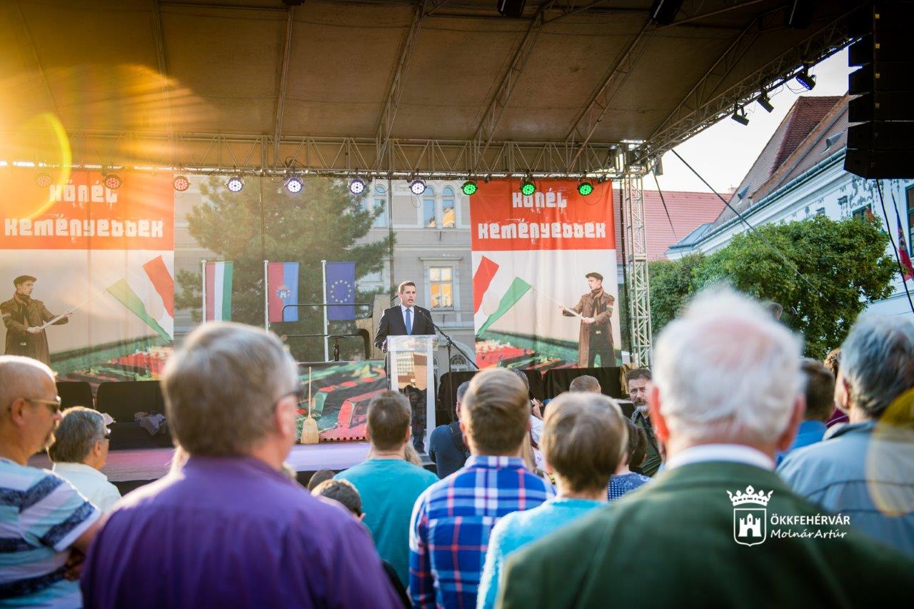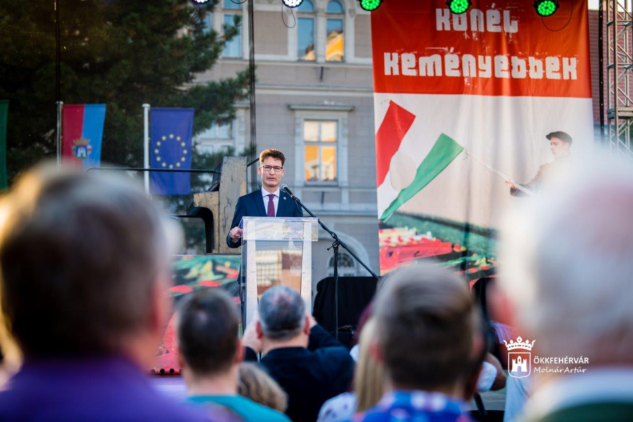 Köszönöm, hogy közösen, együtt emlékezhetünk 56-ra, ami a bátorság és a hősiesség legszentebb megnyilatkozása – kezdte ünnepi beszédét Molnár Krisztián a Fejér Megyei Közgyűlés elnöke. Mint mondta 63 év elteltével is szikrázóan szívet és lelket melengető 1956 üzenete, továbbá példát is mutat mindannyiunknak. „Tisztelegjünk főhajtással a nemzet egysége és a mártírok önfeláldozása előtt, akik a szabadságért, a függetlenségért, egy jobb életért és tulajdonképpen értünk is küzdöttek. 1956 szabadsága dicső örökségünk és felelősségünk, hogy ehhez méltóak legyünk. Nemzeti ünnepünk üzenete: maradjunk hűek önmagunkhoz védjük meg szabadságunkat és keresztény értékeinket.”