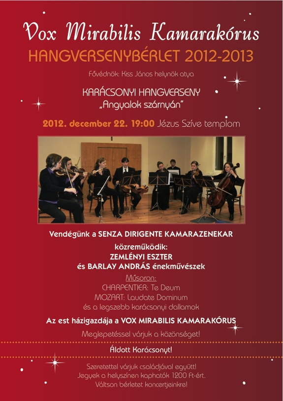 A Vox Mirabilis hangversenybérlet 2. koncertjét tartják december 22-én 19 órakor a Jézus Szíve templomban „Angyalok szárnyán” címmel. Az est vendége lesz a Senza Dirigente Kamarazenekar, valamint Zemlényi Eszter és Barlay András énekművészek. Jegyek a helyszínen kaphatóak 1200 Ft-ért. A műsorban Charpentier „Te Deum” és Mozart „Laudate Dominum” című művei szerepelnek.