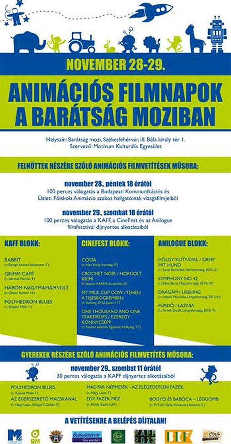 Az Animációs Filmnapok keretében pénteken és szombaton 18 órától 100-100 perces animációs filmvetítést szerveznek a Barátság moziban felnőttek részére a KAFF, a CineFest és az Anilogue filmfesztivál díjnyertes alkotásaiból, valamint a Budapesti Kommunikációs Főiskola és a MOME hallgatóinak vizsgafilmjeiből. Szombaton 11 órától 30 perces, gyerekeknek szóló animációs filmeket vetítenek a KAFF nyertes alkotásaiból.