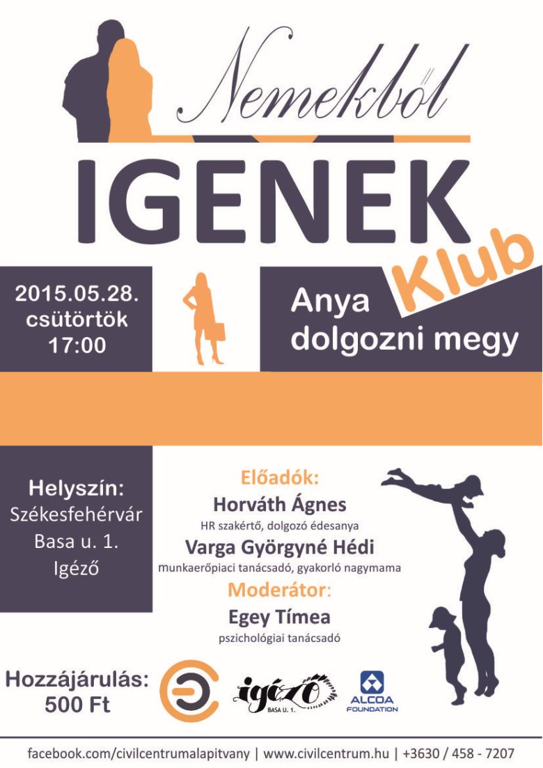 A Civil Centrum Közhasznú Alapítvány május 28-án csütörtökön 17 órától rendezi meg az Igézőben Nemekből igenek klubját, amelynek témája ezúttal a kisgyermekes édesanyák munkavállalása lesz. Választ kaphatunk többek között arra, hogy hány helyen és hogyan kell helytállnia egy kisgyermekes édesanyának és arra is, hogyan egyeztethető össze jól a munka és az anyaság?