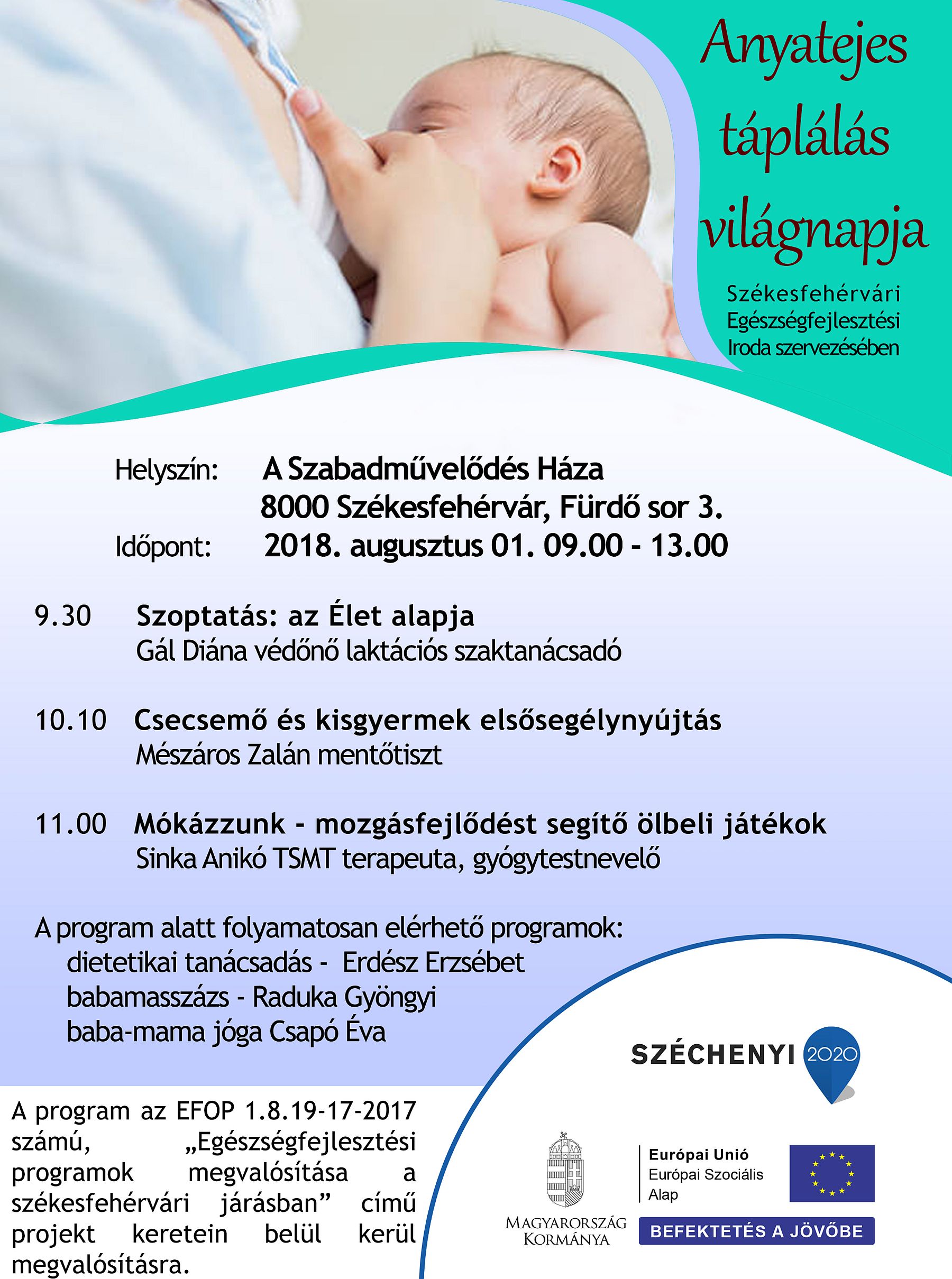 Augusztus 1-jén, szerdán A Szabadművelődés Házában 09.30 órára várják az érdeklődőket. Gál Diána védőnő, laktációs tanácsadó „Szoptatás: az Élet alapja” címmel tart előadást, majd Mészáros Zalán mentőtiszttől megtanulhatják a csecsemőknél és kisgyermekeknél igen hasznos elsősegélynyújtás alapjait. Az előadássorozat mozgásfejlődést segítő ölbeli játékok bemutatójával zárul Sinka Anikó TSMT terapeuta, gyógytestnevelő vezetésével. A program ideje alatt dietetikai tanácsadással, babamasszázzsal és baba-mama jógával várnak mindenkit.